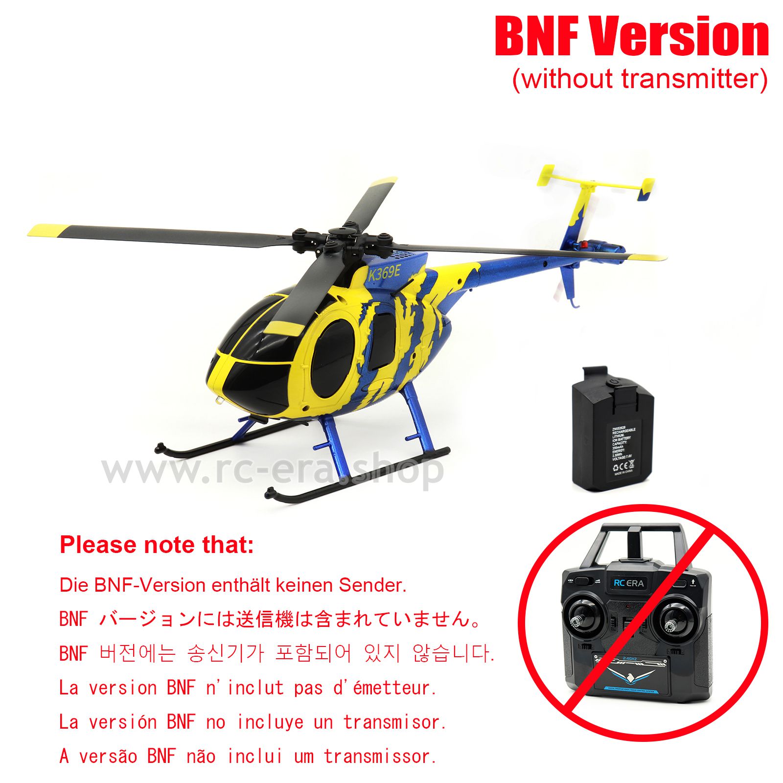 - BNF Version: without transmitter, and it is compatible with the transmitter of most other helicopters from RC ERA (such as: C032/C138/C123/C190/C189/C187/C186/C129V2).