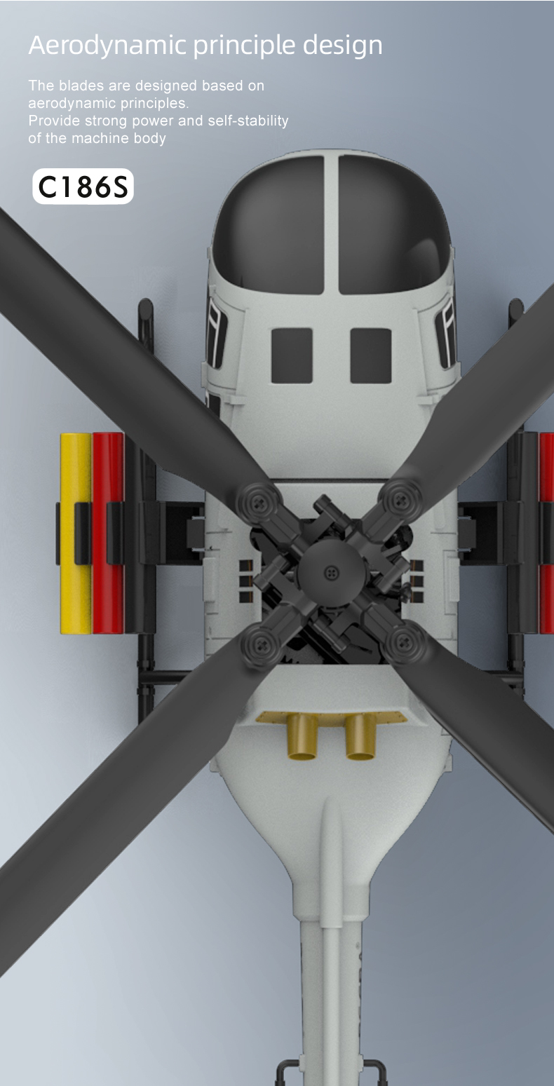 - The product upgrade adopts PA\PC mixed material to be more resistant to impact! The shape is scaled down according to the real machine, which can not only control the flight but also be used as a decoration. The battery life of C186S can reach about 15 minutes!