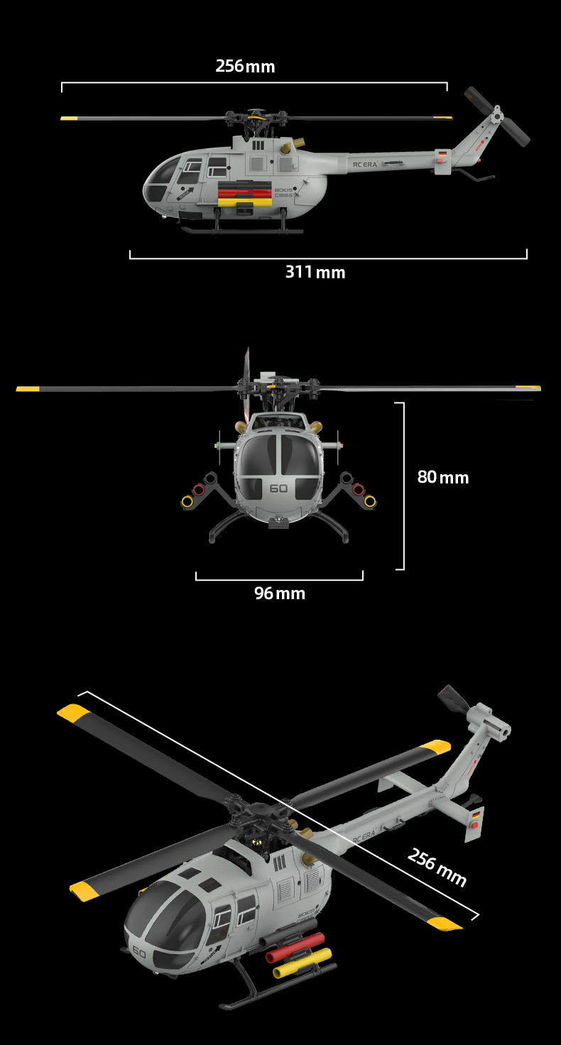 - Helicopter Dimensions: 235 mm (Fuselage length), 256 mm (rotor diameter), 80 mm (height)