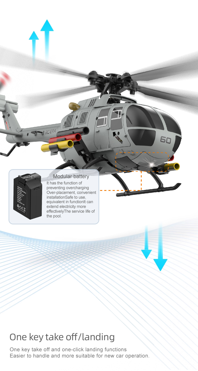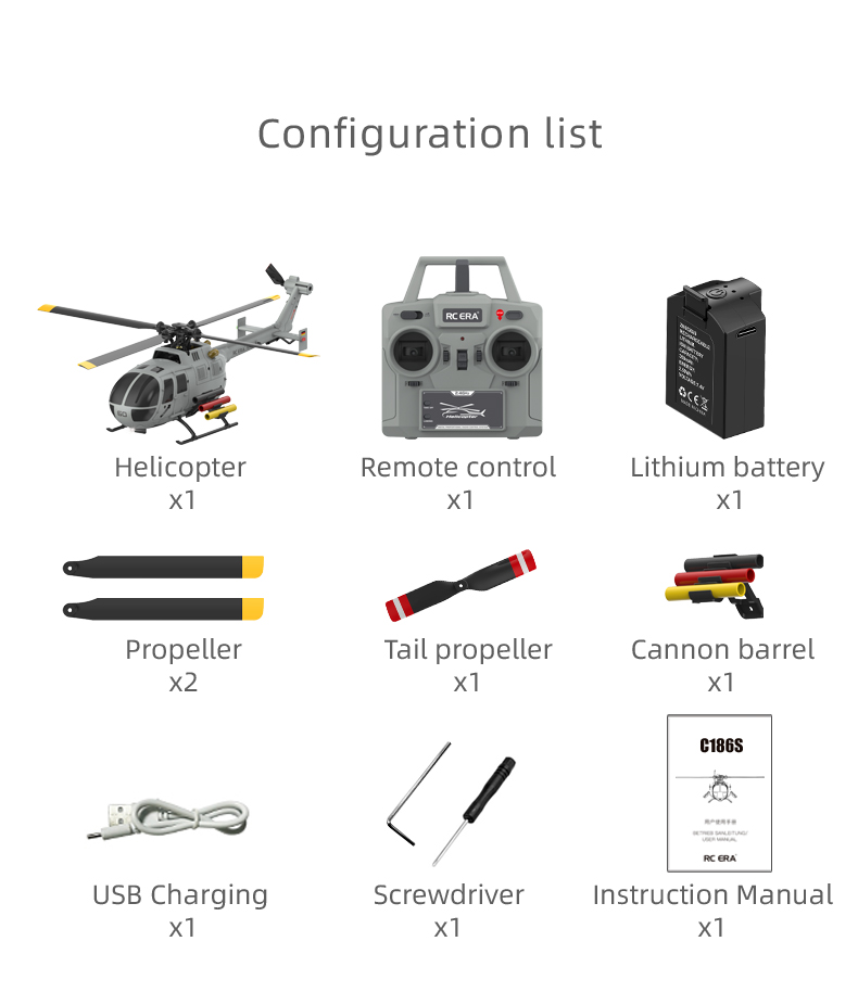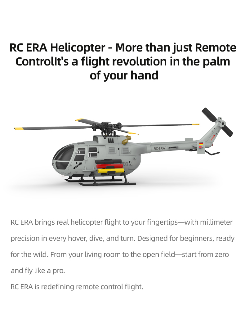 - BNF Version: without transmitter, and it is compatible with the transmitter of most other helicopters from RC ERA (such as: C032/C138/C123/C190/C189/C187/C186)