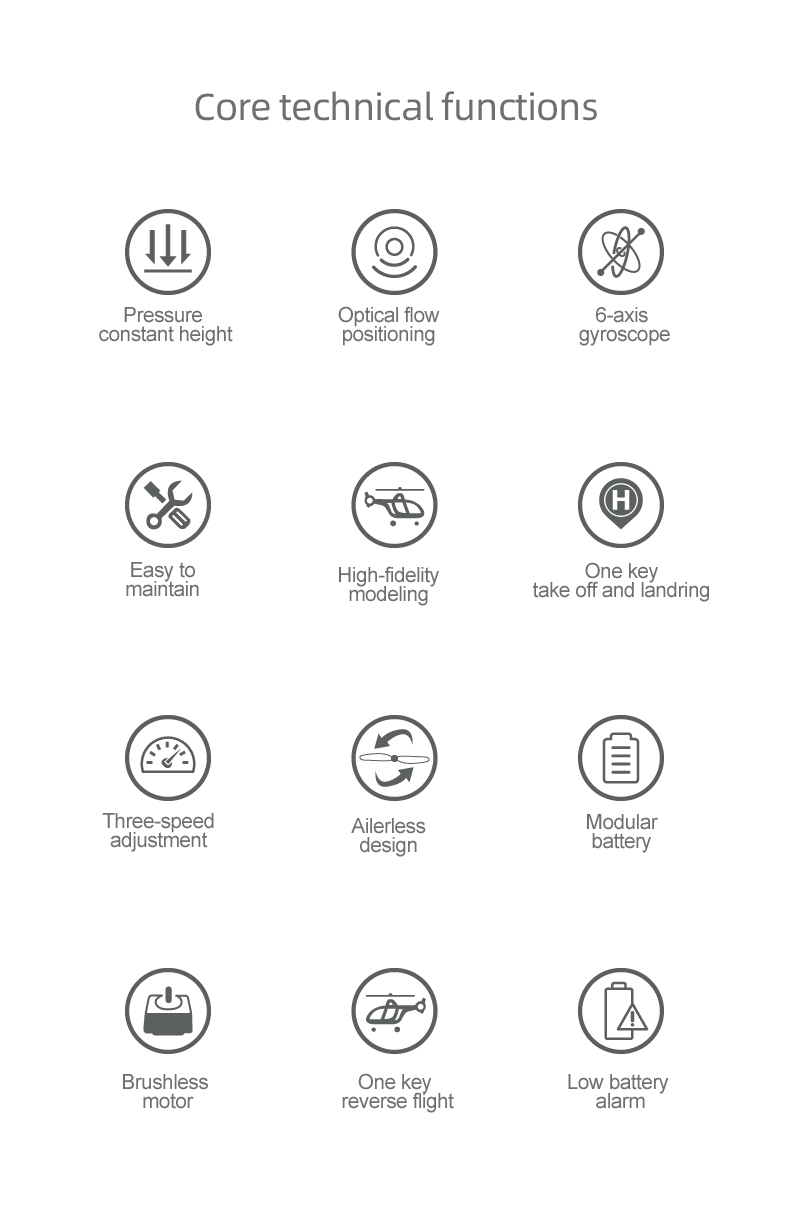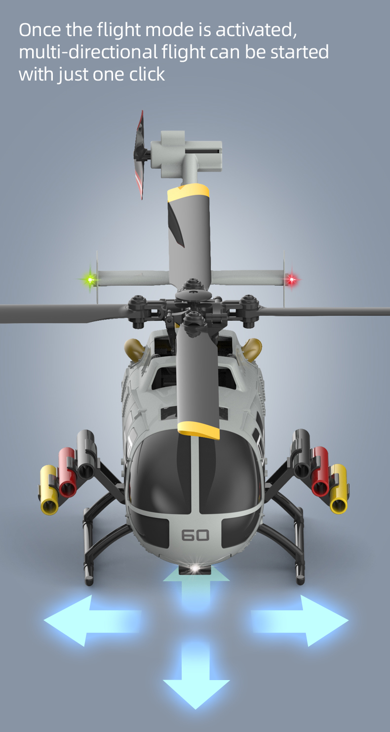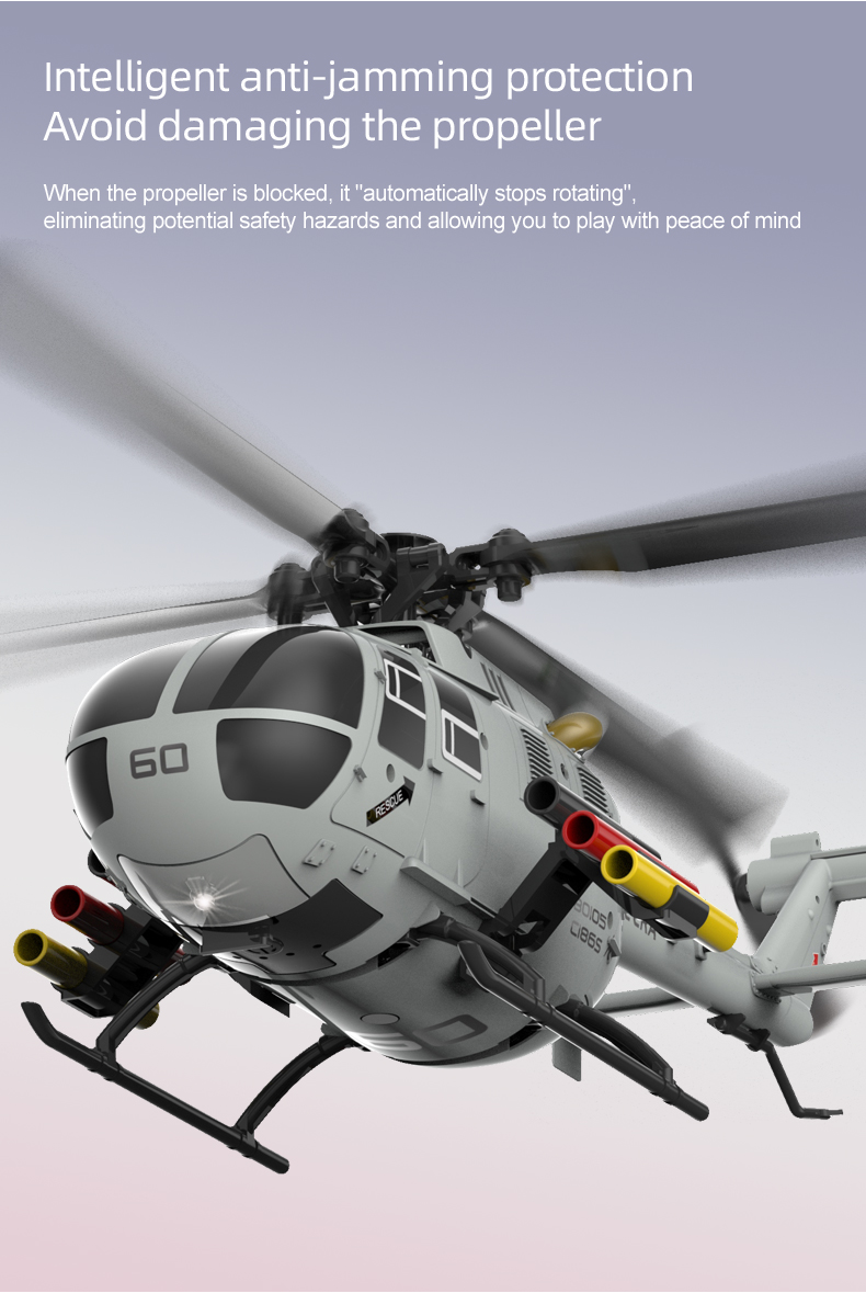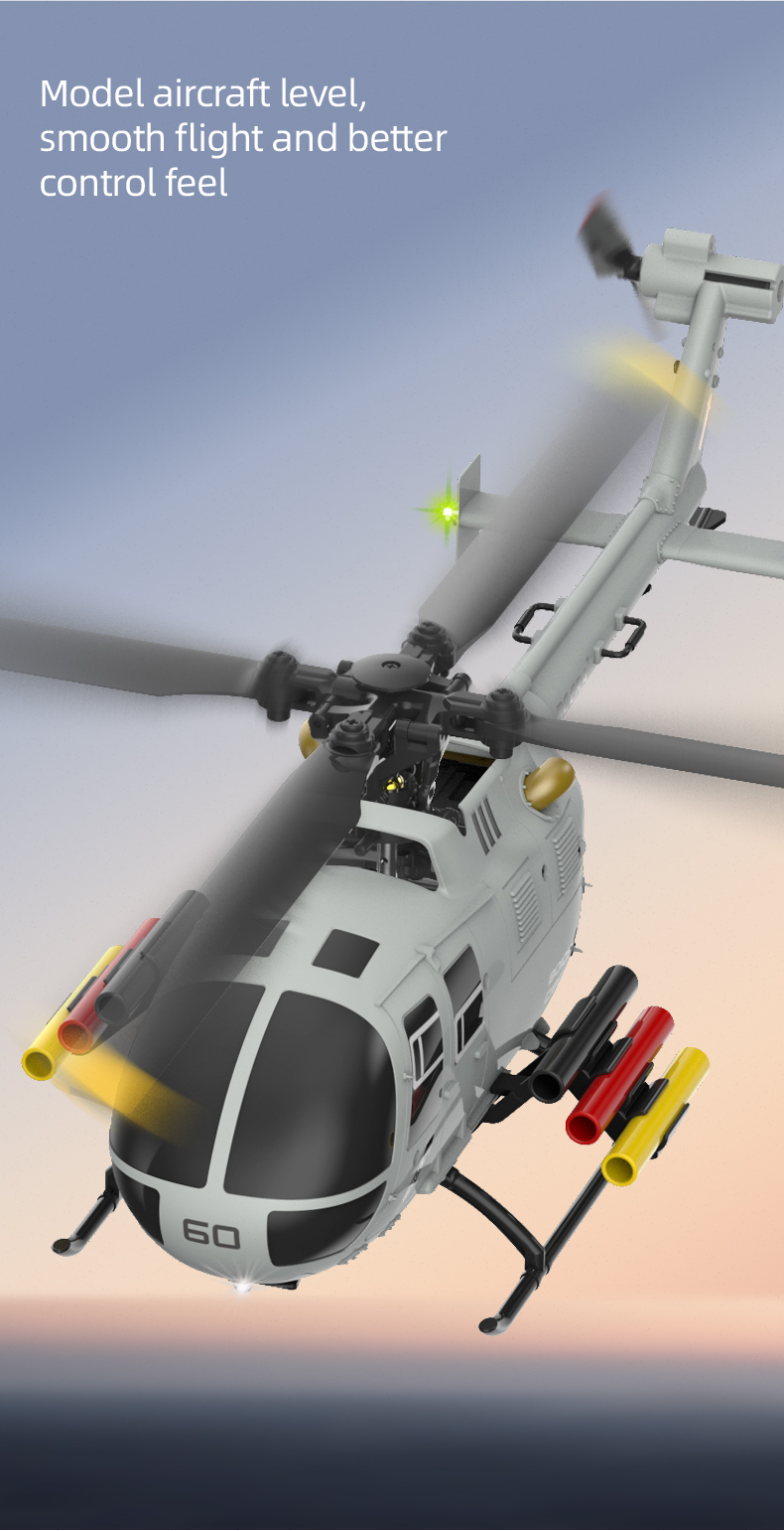 - Aileronless design, utilizing aerodynamic principles to optimize the rotor blades for powerful thrust and natural body stability. The 6-channel collective pitch structure with a 6-axis gyroscope ensures ultra-stable flight performance.